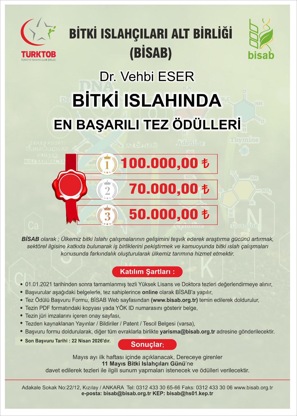 Bitki Islahı konusunda 01.01.2021 tarihinden sonra yayınlanmış, Tezli Yüksek Lisans ve Doktora çalışmalarına ödül verilecektir.Bitki Islahçıları Alt Birliği (BİSAB), 5553 sayılı Tohumculuk Kanununun 16. Maddesine dayanılarak 28.03.2008 tarihinde kurulmuştur. Tohumculuğun temeli olan bitki ıslahçılarının dayanışmasını sağlamak ve ülkemiz tohumculuk sektörünün geliştirilmesi, sektörde faaliyet gösteren gerçek veya tüzel kişiler arasında mesleki dayanışmanın artırılması, tohumculukla ilgilenenlerin ekonomik ve sosyal haklarının korunmasına hizmet amacıyla kurulmuş, tüzel kişiliğe sahip kamu kurumu niteliğinde meslek kuruluşudur.Bitki Islahçıları Alt Birliği her yıl 11 Mayıs’ı BİTKİ ISLAHÇILARI GÜNÜ olarak kutlanmakta; üyelerimizin, bitki ıslahı ve tohumculukla ilgili diğer kamu ve özel sektör kuruluşlarının yetkilileri ile üniversitelerden akademisyen ve öğrencilerin katıldığı bitki ıslahının öneminin anlatıldığı etkinlikler düzenlenmektedir.Bu çerçevede Alt Birliğimiz Yönetim Kurulu; Türkiye Tohumcular Birliği (TÜRKTOB), Tarım ve Orman Bakanlığı ve Üniversitelerle ile iş birliği içinde Bitki Islahı konusunda tamamlanmış/sonuçlanmış Tezli Yüksek Lisans ve Doktora çalışmalarına ödül vermeyi kararlaştırmıştır.Bitki Islahı konusunda 01.01.2021 tarihinden sonra yayınlanmış tez çalışmaları Komisyonlar tarafından değerlendirilerek dereceye giren 3 tez çalışmasına ödül verilecektir.Ayrıca geleneksel hale gelen 11 Mayıs Bitki Islahçıları Günü etkinlikleri kapsamında “Dr. Vehbi ESER En Başarılı Tez Ödülleri Yarışması”nda ödül kazananlar, konusu Alt Birliğimizce belirlenen panele davet edilerek çalışmalarını anlatmaları sağlanacaktır.Katılmak isteyenlerin iletişim bilgileri ile birlikte ekte istenen bilgileri en geç 22 Nisan 2026 tarihine kadar Alt Birliğimizin [email protected] adresine göndermeleri gerekmektedir.